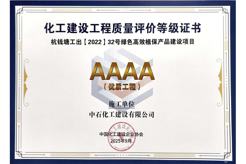 近日,经中国化工建设企业协会组织专家委员会综合评价,由公司承建的雅保四川新材料有限公司雅保年产5万吨氢氧化锂锂电池材料项目湿法二标段 (氢氧化锂装置、硫酸钠装置)及配套公用辅助工程荣获2025年度中国化工建设企业协会“5A”级优质精品工程,杭钱塘工出【2022】32号绿色高效植保产品建设项目荣获中国化工建设企业协会“4A”优质工程。